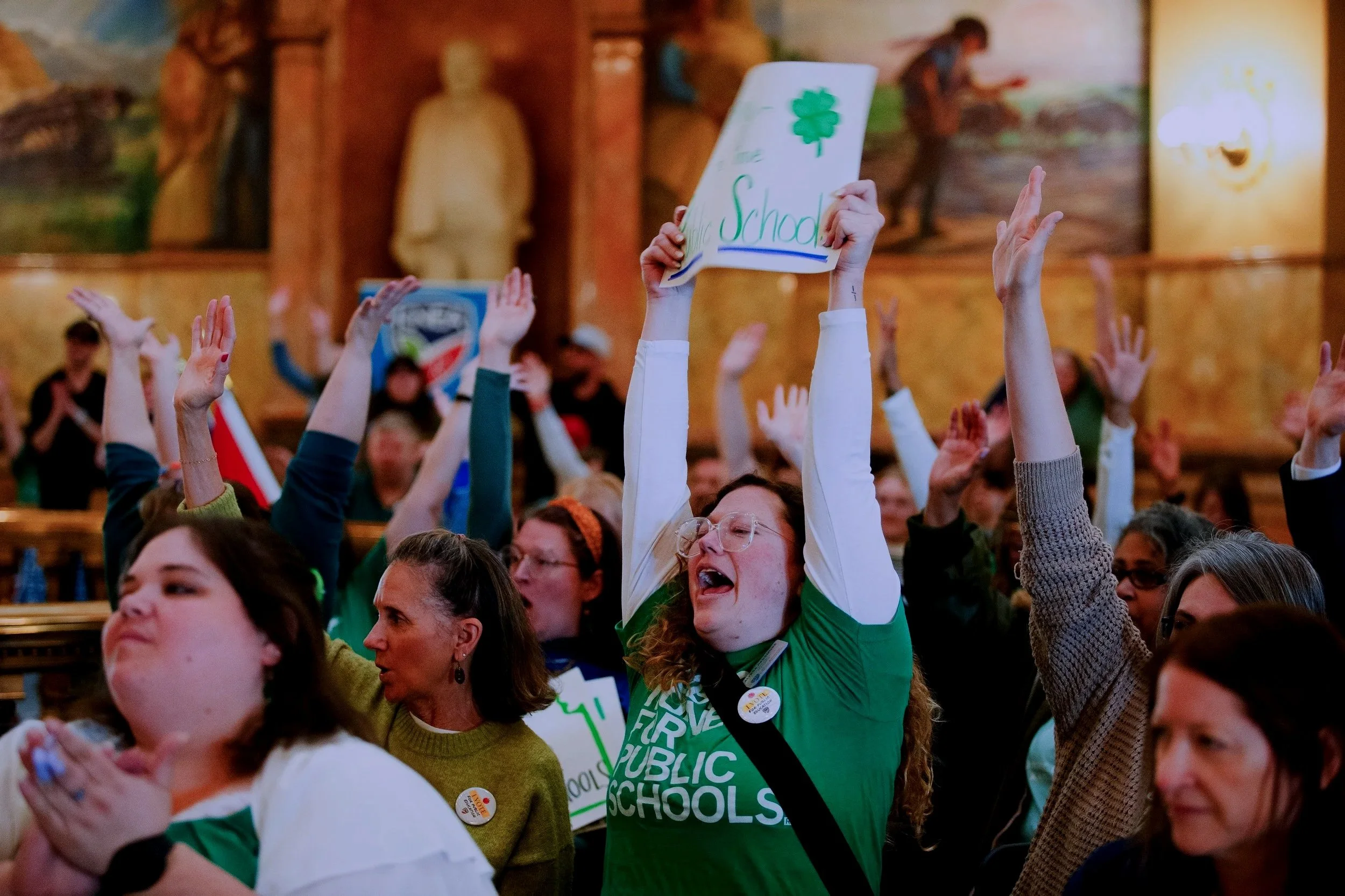 Nearly 200 educators, students and public education supporters join forces at Statehouse to demand fully funded special education and say no to vouchers.