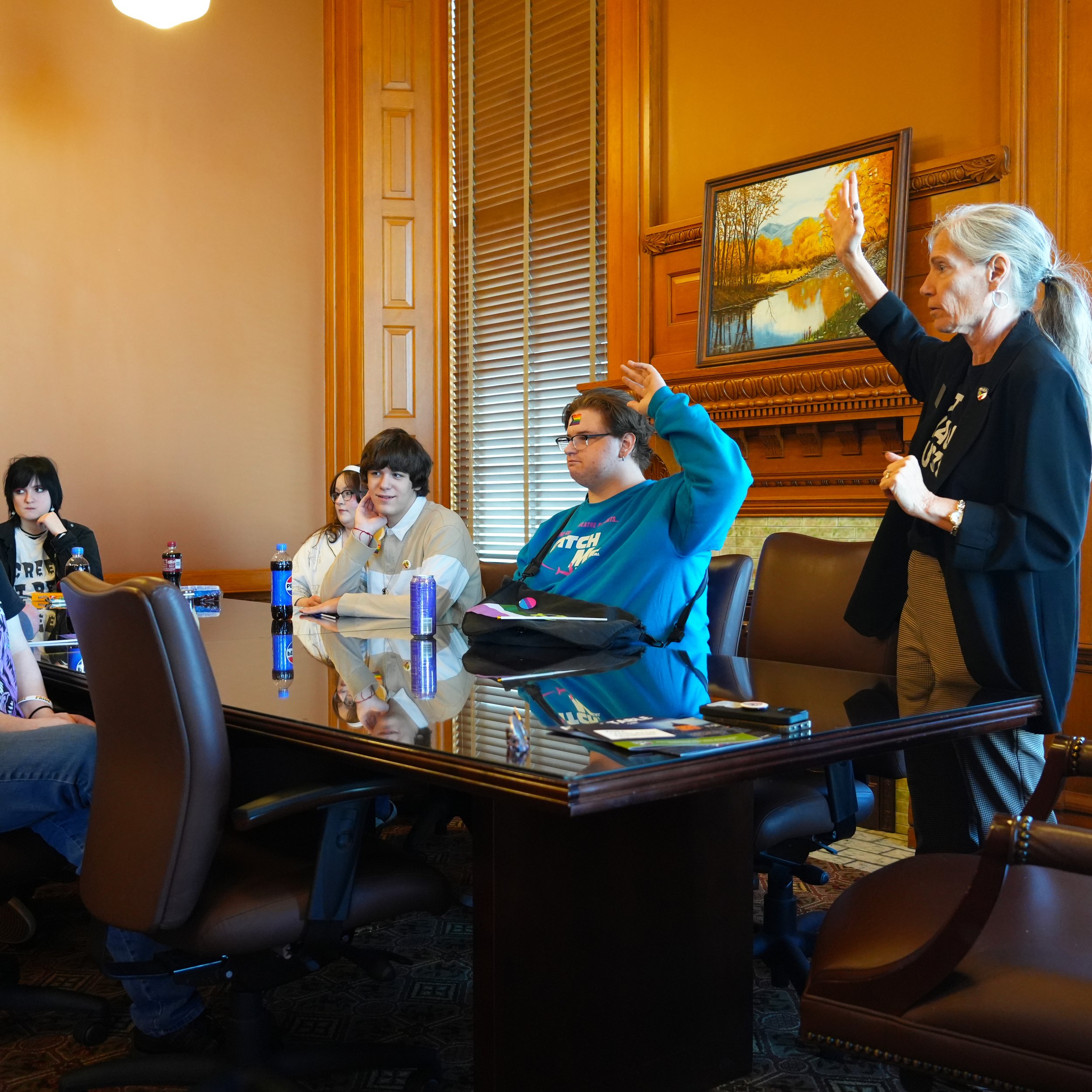 KNEA President Sherri Schwanz spoke with Salina Central High School students on Tuesday, Jan. 20, at the Statehouse in Topeka after the students attended Equality Day.